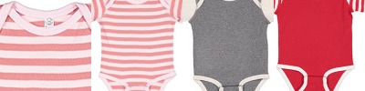 5.3 oz. 100% combed ringspun cotton print 1x1 baby rib; Flatlock seams; Double-needle ribbed binding on neck and shoulders; Reinforced three snap closure; Bleed resistant ink is recommended when printing ; Double-needle ribbed binding on sleeves and leg opening;