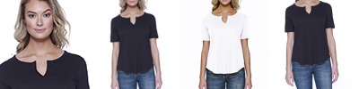 3.69 oz., 50% cotton 50% modal, 30 singles; High-end modal fabric; Peek-a-boo open shoulder; High/low hem; Tear-away label; Made in a w.r.a.p. certified factory;
