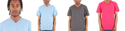 100% 30's preshrunk combed ringspun cotton; Tag-free neck label; Taped shoulder-to-shoulder; double needle stitching; Hemmed sleeves and bottom; Contemporary fit; stylish mitered V-neck; Narrower ribbed collar with coverseaming; Ash 99/1 cotton/poly; Light Steel is 90/10 cotton/poly;