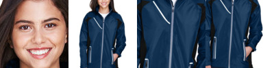 3.7 oz., 100% polyester fully seam-sealed, two-layer waterproof and breathable shell; 3.2 oz, 100% polyester dyed-to-match micro-mesh lining throughout; 6,000 mm waterproof rating and 6,000 g breathability; rollaway three-piece hood with 1¼" rain bill; waterproof reverse coil zipper at center front and pockets with semi-autolock rubber pull tabs; black contrast side panels; reflective tape at right-chest and front pockets; hook and look hem closures at cuffs; drop-tail hem and elastic shockcord protects from the elements;